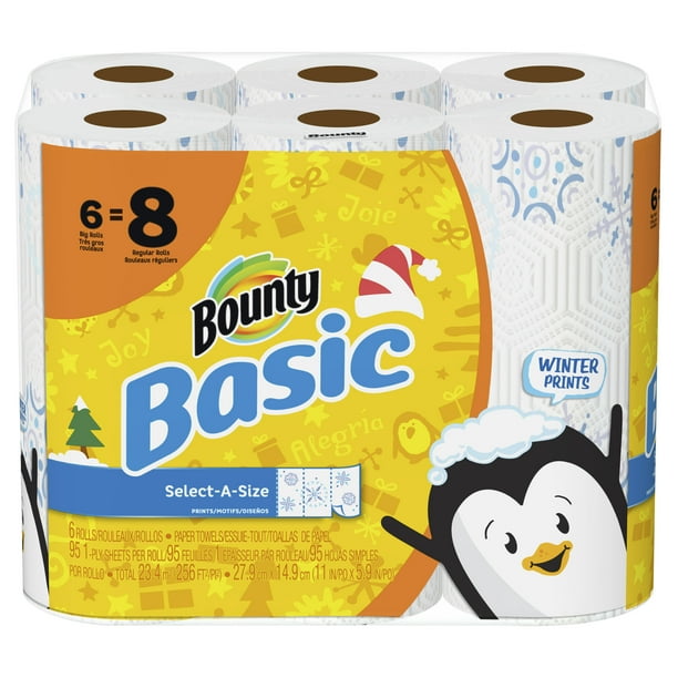 Bounty Basic Select A Size Paper Towels Winter Print 6 Big Rolls 8 Regular Rolls Walmart Com